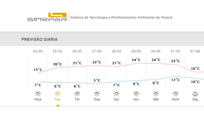 Na quarta-feira (27) o instituto prevê temperaturas entre 5ºC e 23ºC.