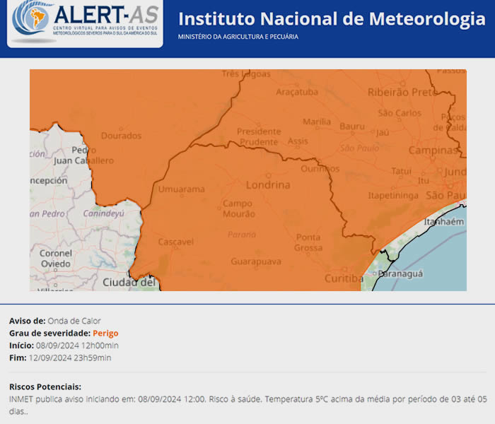 O Instituto Nacional de Meteorologia (Inmet) emitiu um alerta para uma nova onda de calor que chega a várias regiões do país, incluindo Londrina e o Norte do Paraná. O alerta laranja aponta perigo para as altas temperaturas que devem ser registradas nos próximos dias, além da baixa umidade relativa do ar.