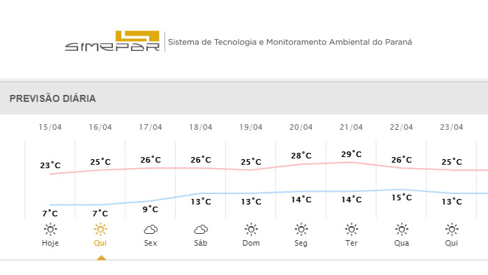 A segunda quinzena de abril vai começar com temperaturas baixas em todo estado do Paraná. De acordo com o Sistema Meteorológico do Paraná (Simepar) os termômetros podem registrar 7ºC na madrugada desta quinta-feira (15) em Londrina e região metropolitana.