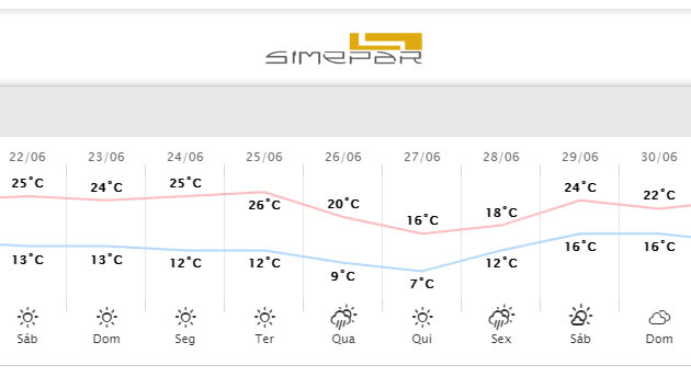 A mínima chega aos 7 ºC na próxima quinta-feira (27), com máxima de apenas 16 ºC. A temperatura média da semana ficará na casa dos 13 ºC.