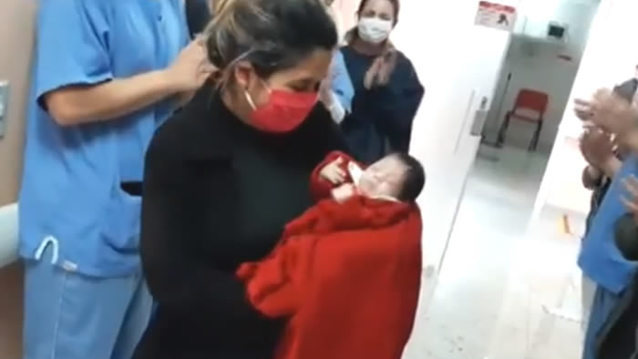 Leonardo, que tem um mês de vida, foi infectado quando 27 dias após o nascimento. Ao receber alta, ele e a mãe foram aplaudidos pela equipe médica e de enfermagem da unidade.