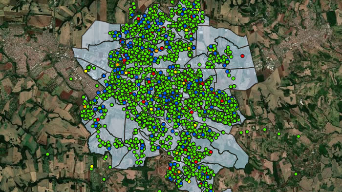 Outra novidade é o mapa georreferenciado, que indica o endereço residencial dos casos confirmados de Covid-19 em Londrina. O quadro apresenta opções de mapa de calor, que indica o nível de concentração de casos, grau de incidência da doença no bairro, e a evolução de cada caso positivado da doença.