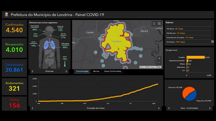 A Prefeitura de Londrina lançou nesta sexta-feira (21), o Painel Covid-19. Em formato de dashboard, a ferramenta on-line será liberada hoje para acesso público, diretamente no site saude.londrina.pr.gov.br/painelcovid19, e no Portal da Prefeitura de Londrina, trazendo indicadores locais atualizados diariamente. O acesso pode ser feito por smartphone, tablet ou computador, basta ter acesso à internet.