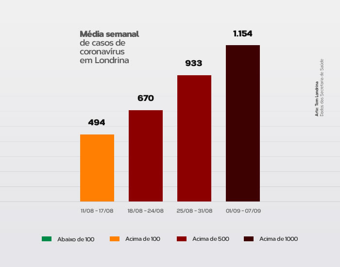 Alarmante: os dados da última semana epidemiológica, contabilizados até 07 de setembro pela Secretaria Municipal de Saúde de Londrina, mostram que a cidade segue no pior período da pandemia do novo coronavírus. Os dados demonstram uma explosão de novos casos da doença e confirma a a nova semana com o maior número de infecções desde o início da crise sanitária, em março. Em apenas sete dias, foram confirmados 1.154 registros. No último boletim, divulgado na noite desta segunda-feira (07), a cidade já havia alcançado 7.050 casos totais.