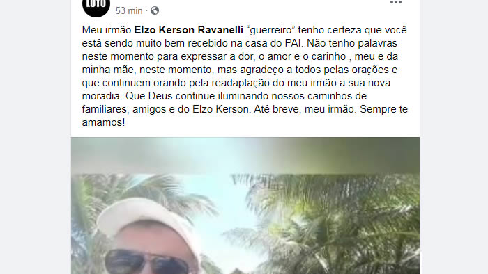 “Meu irmão, Elzo Kerson Ravanelli, lutando pela vida! Nosso herói, que lutou pela vidas de outras pessoas agora está lutando pela própria recuperação. Seja forte que estamos te esperando. Além de ser um herói na sua profissão nesta guerra do planeta é meu ídolo e meu irmão o qual tenho muito carinho e alegria”, escreveu o irmão de Elzo enquanto ele lutava contra o vírus na UTI (Unidade de Terapia Intensiva).