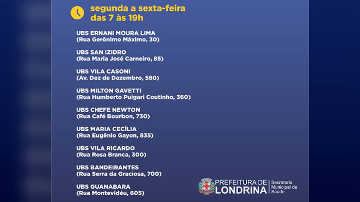 Na live, o secretário de Saúde, Felippe Machado, também anunciou quatro novas Unidades Básicas de Saúde (UBSs) que passam a realizar atendimentos de problemas respiratórios, juntamente com outras cinco unidades que já prestam o serviço. Com isso, passa para nove o número de postos aptos a realizar atendimento a pacientes com suspeita de covid em Londrina.