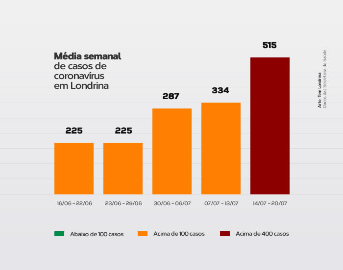 Nos últimos setes dias, o município alcançou 515 novos casos, sendo que na semana anterior foram 334, número abaixo ao da semana de 30/06 a 06/07, que teve 590 novos casos de covid-19.