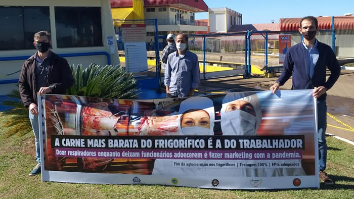 As organizações que representam os trabalhadores se uniram para lançar a a campanha “A carne mais barata do frigorífico é a do trabalhador”. Segundo Cleilson Ramos Mattos, presidente do Sindicato dos Trabalhadores nas Indústrias de Alimentação de Jaguapitã, as principais reivindicações são a testagem em massa dos trabalhadores e que a troca das máscaras fornecidas pelas empresas seja feita diariamente. “Hoje as empresas fornecem as máscaras, mas é somente uma por semana. Então, o trabalhador tem que guardar a máscara junto com o restante do uniforme ao longo da semana toda, o que facilita a contaminação. Além disso, a gente quer a testagem em massa para descobrir quem realmente está contaminado dentro do frigorífico e transmitindo a doença”, explicou Mattos.