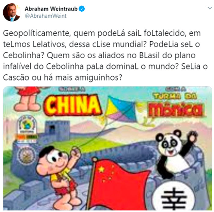 O motivo mais recente para indignação chinesa foram os ataques ofensivos do ministro da Educação, Abraham Weintraub. No último sábado, em postagem no Twitter (que ele apagou depois), o auxiliar do presidente usou o personagem Cebolinha, da Turma da Mônica, para ironizar a China, onde teve início o alastramento do coronavírus.