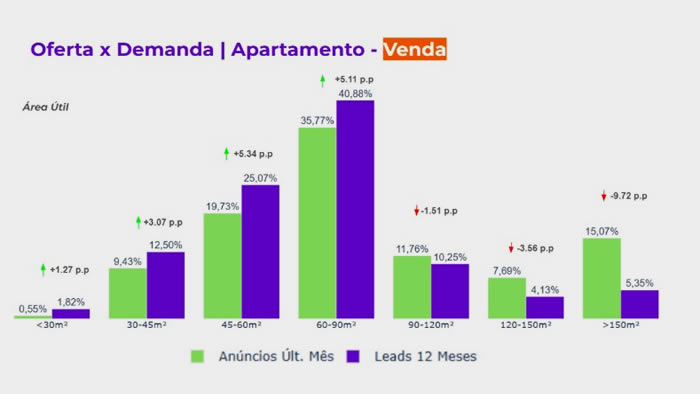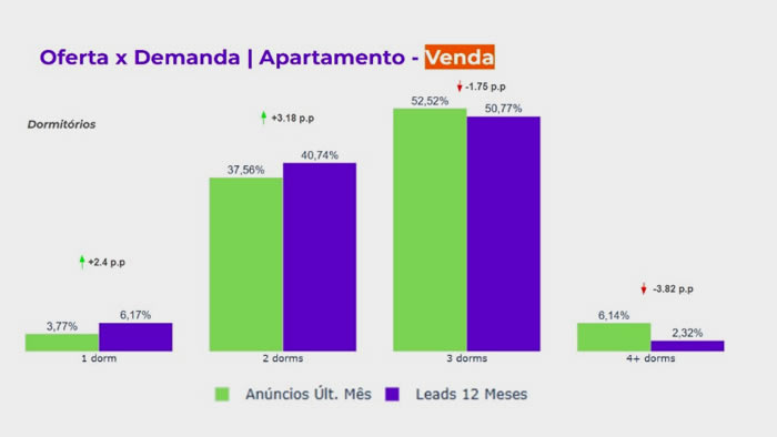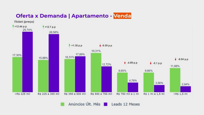 No entanto, quando avaliado o critério preço, há um descompasso entre as buscas por apartamentos até R$ 500 mil, que representam mais de 75% do interesse, mas a oferta representa 49% da amostra.