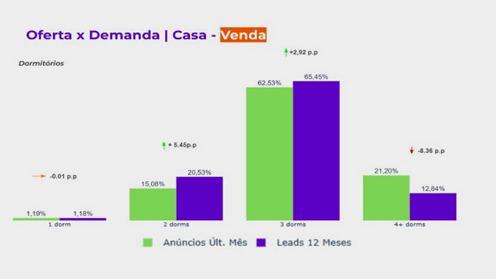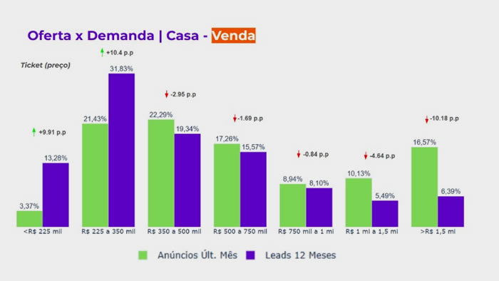 No que se refere às casas à venda em Londrina, o estudo mostra que os imóveis com três dormitórios são os mais procurados, correspondendo a 65% da demanda, em linha com a oferta, correspondente a 62% dos anúncios. A busca por propriedades com metragem entre 60 e 150m² também é significativa (68%), enquanto a oferta nessa faixa corresponde a 52% do total anunciado. Os dados indicam uma discrepância em relação ao tíquete médio: 45% dos compradores desejam pagar até R$ 350 mil por uma casa, porém apenas 25% dos anúncios se enquadram nessa faixa de preço.
