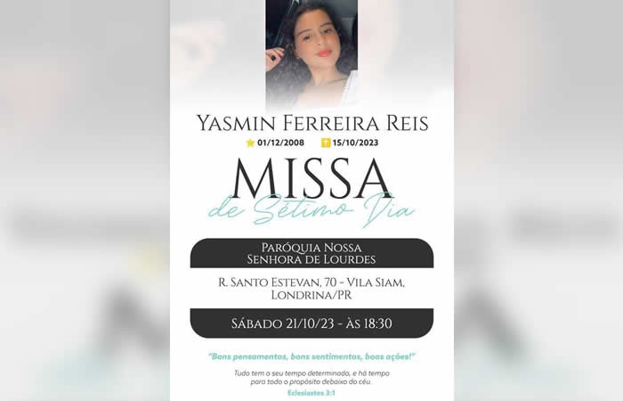 A missa de sétimo dia da pequena Yasmin Ferreira Reis, de 14 anos, atleta da categoria de base do Londrina Futsal, vítima fatal de um acidente ocorrido no último domingo (15), na BR-373, em Ponta Grossa, acontecerá neste sábado (21), em Londrina.