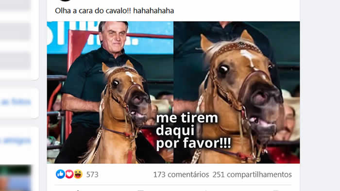 Na imagem, o animal aparenta estar assustado enquanto carrega o chefe do executivo federal. A foto tem circulado na web e internautas aproveitaram para fazer brincadeiras e memes.
