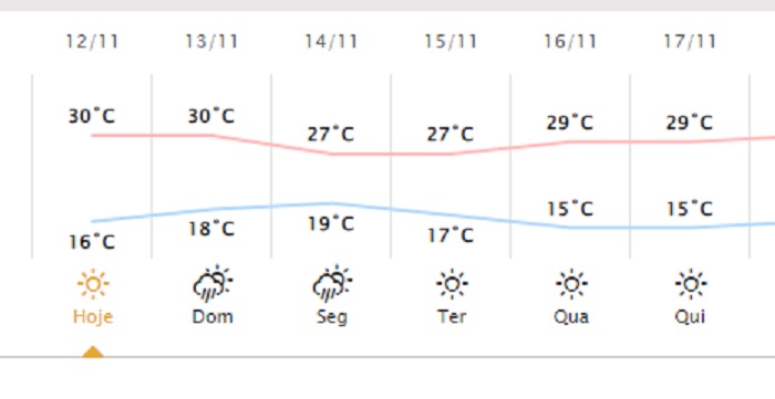 Já o domingo (13), tem previsão de chuva e o dia deve ficar parcialmente nublado com pancadas de chuva. Apesar da chuva, o calor deve permanecer na cidade. A temperatura varia de 18°C a 30°C.