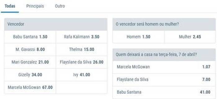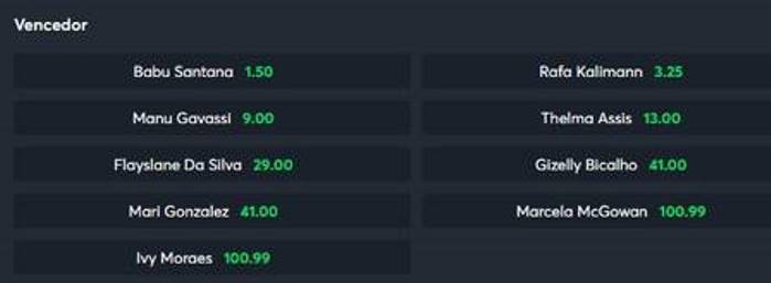 Outro site permite as apostas para o vencedor da atração. Babu Santana é cotado como favorito, por isso o seu valor é menor, 1,50. Em segundo lugar está Rafa Kalimann, com 3,50, seguida de Manu Gavassi, com 9,00 e, depois, Thelma Assis, com 13,00.